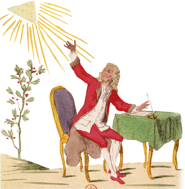 Gravura do século XVIII representando o filósofo iluminista Voltaire sentado à sua mesa. O termo “iluminismo” originou-se da ideia de que a Europa viveu um longo período de trevas, a Idade Média, resultado do controle da Igreja sobre a cultura e a sociedade. Na visão dos iluministas, só a razão poderia colocar a história humana no caminho da luz